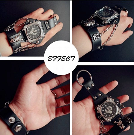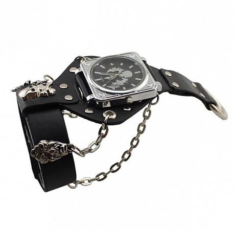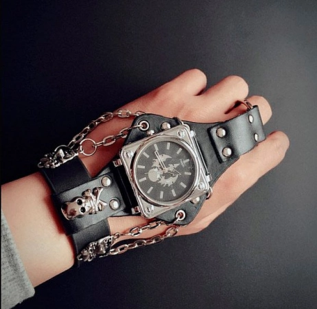 Cette montre attire la synthèse de la forme inhabituelle et de la fabricabilité. La décision stylistique est très réussie.Du cuir brut, des chaînes, un crâne sur un bracelet, une abondance de rivets - tout cela a l'air impressionnant. Le cadran est carré, caché en dessous se cache un mouvement à quartz assez précis avec un fonctionnement silencieux. Du côté technique de cette montre, tout est en ordre. Ils fonctionnent sur piles. Mais le facteur de forme d'origine présente un certain nombre d'inconvénients. Le cadran est légèrement surélevé et peut s'accrocher aux vêtements. Le bracelet qui fixe la montre au bracelet semble peu fiable. Eh bien, en raison de l'abondance de chaînes et d'anneaux en métal, vous ne marcherez pas longtemps dans une telle montre en givre. La livraison d'un lot avec Aliexpress est rapide, mais payante.