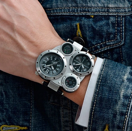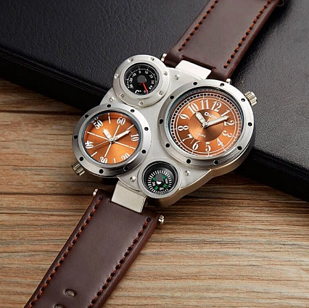 Plus il y a de cadrans, mieux c'est. Apparemment, les développeurs de ces montres inhabituelles d'Aliexpress ont été guidés par ce principe. Il y en a quatre ici. Cependant, seuls trois fonctionnent. Seule la boussole ne fonctionne pas - sa flèche se déplace, mais de manière aléatoire. La température est mesurée par l'horloge, le temps est compté. Précision - pas de remarques. Il y a des minutes et des secondes, les chiffres sont bien lus. La montre est belle, chère et pas encombrante du tout, même sur une main fine. Le vendeur a trois options de couleur pour ce modèle. Tous sont livrés avec des lanières en similicuir. La chose est inhabituelle et élégante, mais si le mécanisme tombe en panne, il ne sera pas possible de le réparer, car nous n'avons tout simplement pas de pièces de rechange pour de telles montres.