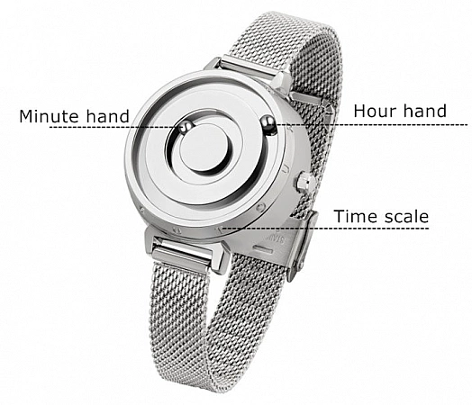 Le rôle des aiguilles dans cette montre inhabituelle est assuré par des boules magnétiques qui, comme des planètes, se déplacent librement autour du point central. Un aimant indique les heures, le second les minutes.