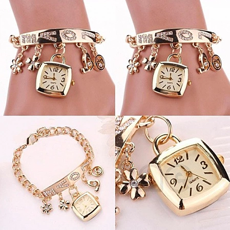 La montre ressemble à un bracelet Pandora. Il y a des attaches sur la plaque de métal, auxquelles diverses figures sont suspendues. Il s'est avéré que des bijoux féminins élégants coûtaient un sou. Dans les avis sur le produit - que du plaisir. La montre est vraiment magnifique. Elles s'usent bien, les rayures n'apparaissent pas trop vite. Et il n'y a pas de prétentions particulières à la qualité des performances. Mais il y a une chance de recevoir un produit défectueux - le vendeur vérifie distraitement les colis. C'est rare et l'argent peut être restitué sans problème. Mais qui veut perdre du temps à attendre. Les accessoires sont les moins chers, mais pour un tel prix, on s'y attend. C'est pour ces moments que les acheteurs réduisent la note du produit.