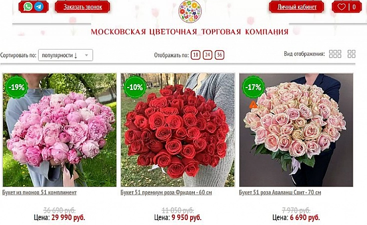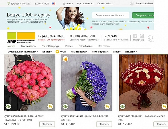 Le réseau international de livraison de fleurs est l'un des leaders du marché russe dans ce segment. Ses principaux avantages sont une livraison rapide (environ 4 heures), une approche individuelle et la prise en compte de toutes les préférences du client, ainsi qu'une commande rapide dans la boutique en ligne. Lors de la création de ses bouquets, AMF utilise des fleurs fraîches de haute qualité provenant de différentes parties du monde. La gamme comprend des bouquets de toute complexité et de toute taille. Parmi eux, il y a d'énormes compositions composées de plus de 100 fleurs. Ici vous pouvez trouver des bouquets bon marché d'une valeur allant jusqu'à 3000 roubles.