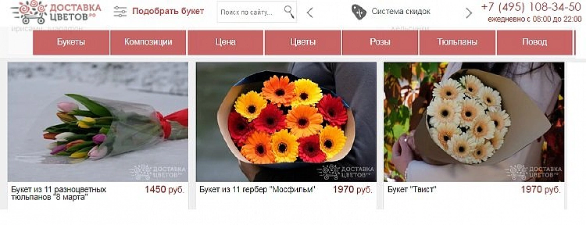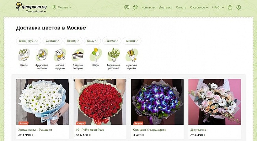 Le menu principal comporte plusieurs sections : occasion, à qui, promotions, cadeaux. Ce dernier comprend des ensembles sucrés, des florariums (fleurs dans un récipient en verre spécial qui restent fraîches toute l'année). Vous pouvez passer une commande sur le site 24 heures sur 24. La livraison est entièrement gratuite. Vous avez le choix entre plusieurs méthodes de paiement.Si le client n'est pas satisfait de la qualité du bouquet, l'argent lui sera facilement restitué.