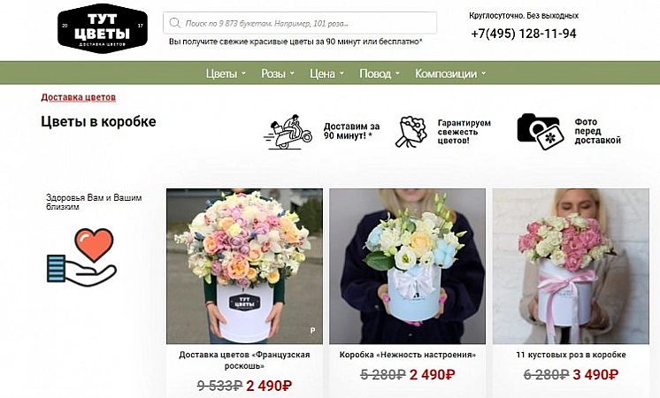 Il était impossible d'ignorer le service de livraison de fleurs "Bouquet russe" lors de la compilation de la note des meilleurs, car vous pouvez trouver de nombreuses critiques à ce sujet sur le net. Ce service attire les clients avec un fonctionnement 24h / 24, une livraison gratuite pendant la journée et juste une vaste sélection de bouquets, de compositions cadeaux et de compléments.