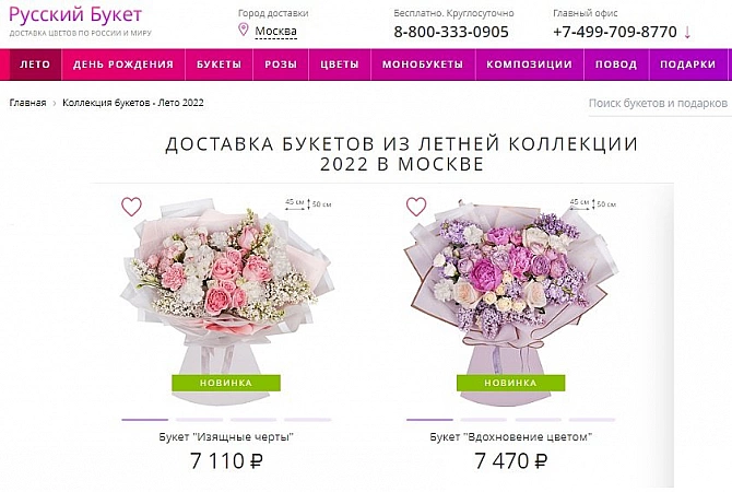 Le site est rendu très pratique, il a un accès rapide à tous les produits. Vous pouvez choisir à la fois des compositions toutes faites et directement sur le site pour récupérer un bouquet de fleurs que vous aimez. Lors de la commande, le client choisit lui-même la taille et la couleur du coffret (ciel de Paris, velours rouge, perles roses, etc.).Vous pouvez commander la livraison à tout moment, mais cela vaut la peine de considérer qu'il faudra au moins 30 minutes pour assembler le bouquet, et si vous devez apporter des fleurs après 21 heures, il est préférable de passer une commande au moins 12 heures à l'avance. . La livraison dans le périphérique de Moscou coûte 500 roubles, en dehors du périphérique de Moscou, elle est également effectuée, mais elle sera plus chère.