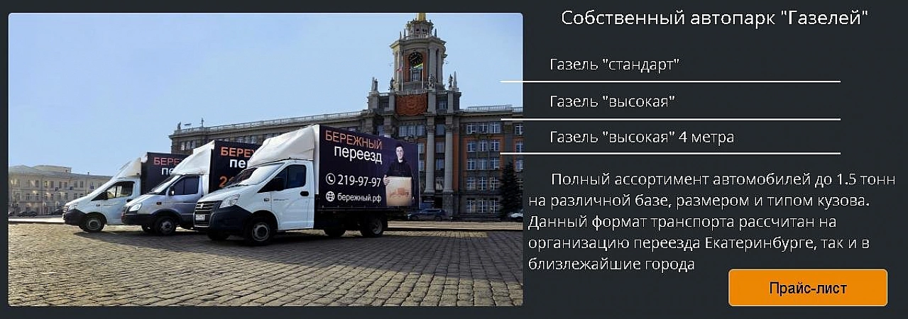 Berezhnoy Pereezd dispose d'une flotte de véhicules Gazel d'une capacité de charge allant jusqu'à 1,5 tonne et d'un personnel de chargeurs. Les personnes et les entreprises tierces ne sont pas impliquées dans les travaux. La société organise des transferts à Ekaterinbourg et interurbains. Pour les longues distances, la route est payante dans les deux sens au tarif de 16 roubles par kilomètre. Un service complet comprend l'emballage, le démontage et l'emballage des meubles. La brigade apporte avec elle le matériel d'emballage.Dans un nouvel appartement, tout se passe dans l'ordre inverse - déballer les choses, assembler et ranger les meubles. Si vous le souhaitez, vous pouvez tout préparer vous-même, commander uniquement le chargement et le transport. Selon les clients, les chargeurs arrivent rapidement, travaillent avec précision. Les avantages comprennent des prix abordables, un travail 24 heures sur 24 et un paiement à la fin de la commande. Les plaintes ne se rencontrent que sur des chargeurs séparés.
