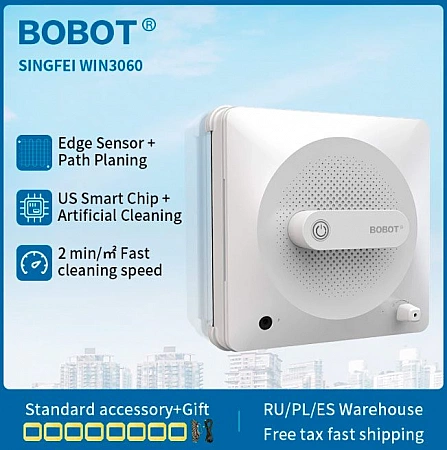 يقوم هذا الروبوت بتنظيف وغسل وتلميع الزجاج حتى يلمع. ولا يتطلب أي صيانة تقريبًا - قم بتغيير المناديل وراقب عمل الغسالة. محرك ذكي مسؤول عن تحريك الجهاز ، بمساعدة الروبوت يتحرك على طول المسار الحر. يساعد المصد رباعي الجوانب في تحديد العوائق والإطارات. تعمل المستشعرات بشكل جيد ، بحيث لا يتجاوز الروبوت الحدود الآمنة ويمكنه العمل مع هياكل بدون إطار بعرض يزيد عن متر واحد. لكنه لا يزال يترك مناطق غير مغسولة - هذه هي الزوايا وحوالي 0.5 سم من الزجاج من أقصى حافة النافذة. من الأفضل رش "الكيمياء" مباشرة على النافذة ، وليس على منديل ، وإلا فإن الوحدة تبطئ وتبقى في وضع رأسي.