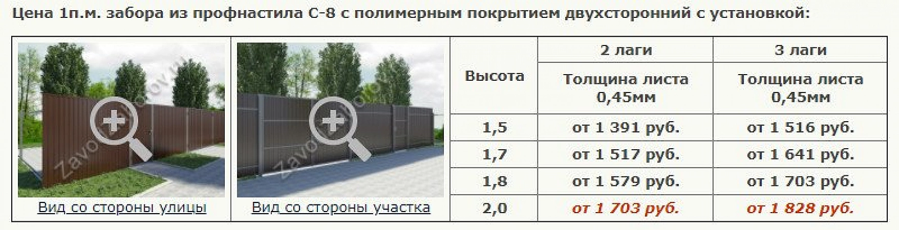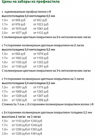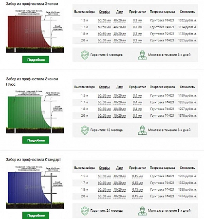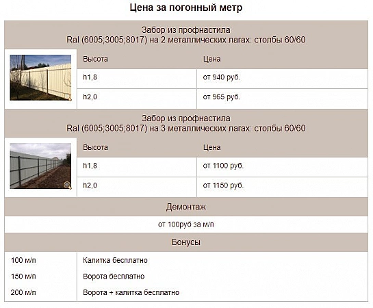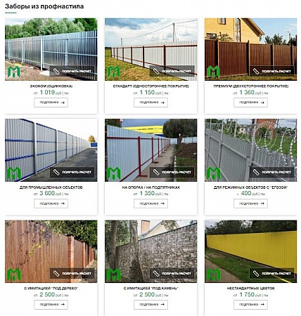 تبيع هذه الشركة وتثبت أسوار صفائح ملفوفة بأقل تكلفة في الاختيار. هنا يمكنك طلب تصميم رخيص بسعر يتراوح بين 600-700 روبل. لكل متر تشغيل.