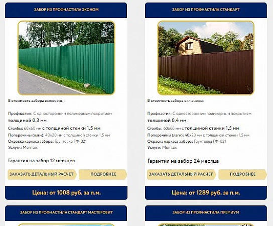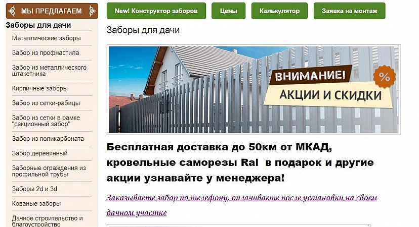 أشهر شركة تركيب سياج في موسكو ومنطقة موسكو. تنشر الشركة علانية حتى المراجعات السلبية على موقعها على الإنترنت ، وتستجيب لها بسرعة وتحل المشاكل القائمة. هنا يمكنك طلب تصنيع وتركيب سياج ربط سلسلة ، لوح مموج ، سياج اعتصام ، خشب ، وكذلك شراء سياج مقطعي ثلاثي الأبعاد جاهز. تكلفة المواد والعمل من الشركة مناسبة تمامًا.صحيح أن الأسعار النهائية لا تزال مختلفة عن المبالغ التي أشار إليها المديرون. وبعض المتخصصين لا يهتمون تمامًا بالترتيب: يغيرون حجم السياج واللون وعدد المكونات ويقومون بأعمال التثبيت بشكل غير احترافي. لكن الشركة تصحح جميع أوجه القصور بناءً على طلب العميل
