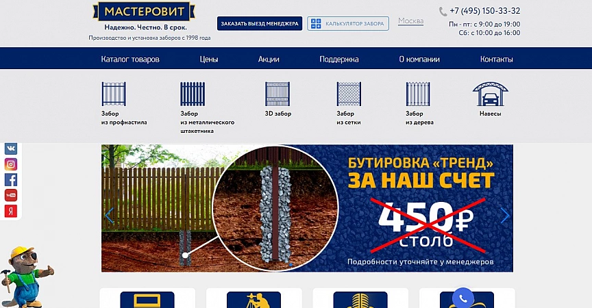 شركة بأسعار مناسبة. تشارك في تركيب الأسوار المصنوعة من الألواح المموجة ، والسياج المعدني ، وربط السلسلة والخشب ، وتقوم بتركيب بوابات آلية قابلة للسحب مع أعمدة من الطوب في موسكو ومنطقة موسكو. يثني العملاء على الشركة لتركيزها على العملاء واختيارها للمشروع المناسب ، مع مراعاة ميزانية العميل. أيضًا ، يتحدث أصحاب الأسوار الجديدة السعداء عن الاستجابة الفورية لقسم مراقبة الجودة. إذا كان عمل أي من الفرق لا يناسب العميل ، تقوم الشركة بسرعة بإرسال متخصص لحل المشكلة. ولكن مع ذلك ، فإن المشاكل المتعلقة بجودة التركيب شوهت سمعة الشركة إلى حد كبير: تصنيفها أقل بشكل ملحوظ من تصنيف المقاولين الآخرين المشهورين في العاصمة.