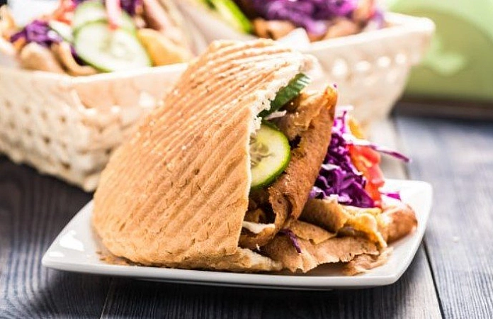 الشاورما مصنوعة من لحم الصويا ، والبيض لا يستخدم في خبز البيتا. تضيف الصلصة المميزة ومخلل شنيتزل الخضار طعمًا مميزًا للطبق.