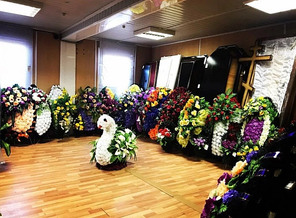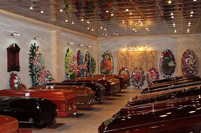 تقدم الشركة للعملاء مجموعة كبيرة من التوابيت وأكاليل الزهور والملابس الجنائزية وغيرها من الأدوات الضرورية للحفل.