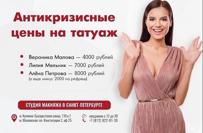 ليس الصالون الأكثر شعبية في سانت بطرسبرغ ، ولكن يتم تقديم المكياج الدائم بأسعار أقل من المتوسط في المدينة. يتم عمل وشم الحواجب باستخدام طريقة واحدة فقط للرش بالبودرة ، لكنها تبدو جميلة وطبيعية. يمكن أيضًا أن يعزى قرب الموقع من المترو إلى إيجابيات المؤسسة.