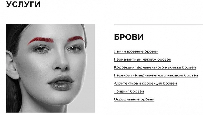 الحاجب الحاجب! والمكياج! يقدم كل شيء لجعل حواجبك تبدو مثالية. هناك أيضًا التصحيح المعتاد والتلوين والتصميم طويل المدى. أيضًا ، يقوم أساتذة شريط الحاجب بعمل وشم الحاجب باستخدام طريقة رش المسحوق - إجراء المكياج الدائم الأكثر ألمًا والذي يعطي التأثير الأكثر طبيعية. التكلفة مرتفعة للغاية ، لكنهم يقومون بذلك بكفاءة ودقة.