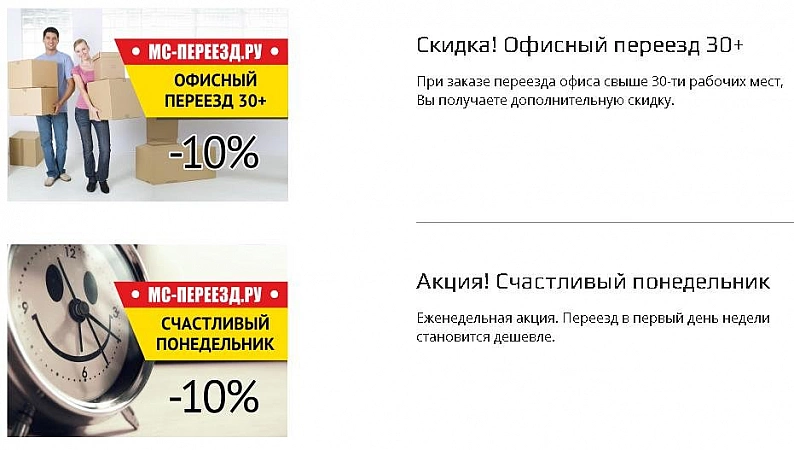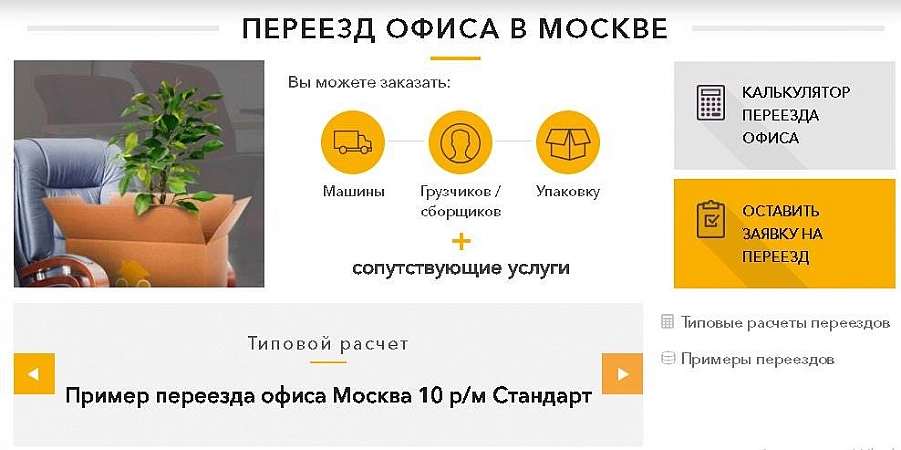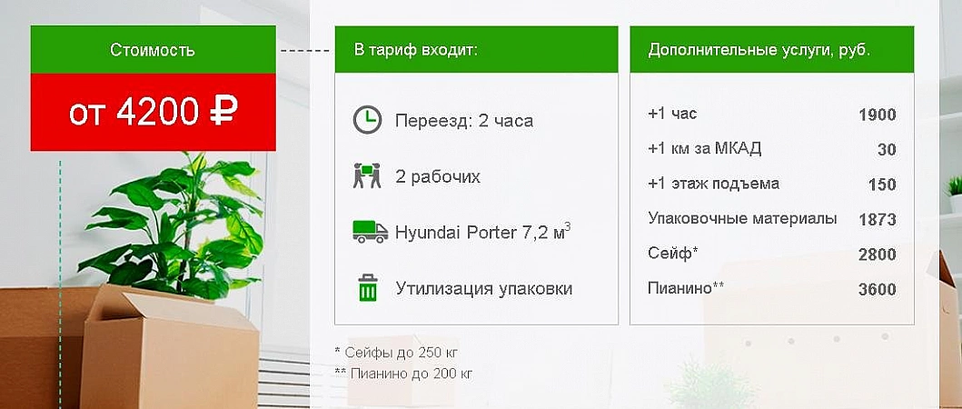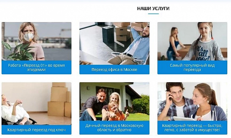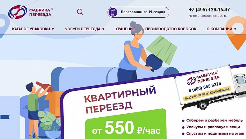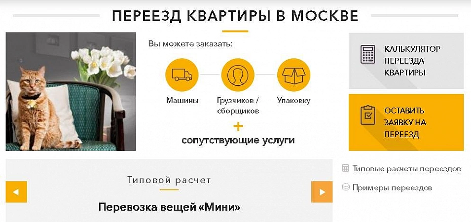 تأسست الشركة في موسكو عام 2007. يساعد في الانتقال من الشقق والمكاتب والمنازل الخاصة والبيوت والمنازل الريفية. يوفر مجموعة كاملة من الخدمات للتغليف والتحميل والنقل والتخلص من الأثاث القديم وجمع القمامة وتجميع وتفكيك الأثاث. يوفر خدمات النقل. يبدأ عمل اللوادر من 250 روبل في الساعة ، ولا يتم الإشارة إلى تكلفة الخدمات الأخرى في الموقع. لحساب السعر الأولي ، تعرض الشركة ملء طلب على موقع الويب والاتصال بالمشغل. إذا كنت بحاجة إلى صناديق من الورق المقوى للأشياء الصغيرة ، فيمكنك شرائها من متاجر التعبئة والتغليف الخاصة بالشركة. هناك العديد من المراجعات حول الشركة ومعظمها إيجابي. ولكن بدون شكاوى فردية ليست كاملة. غالبًا ما ترتبط بتأخير حركة السيارات.