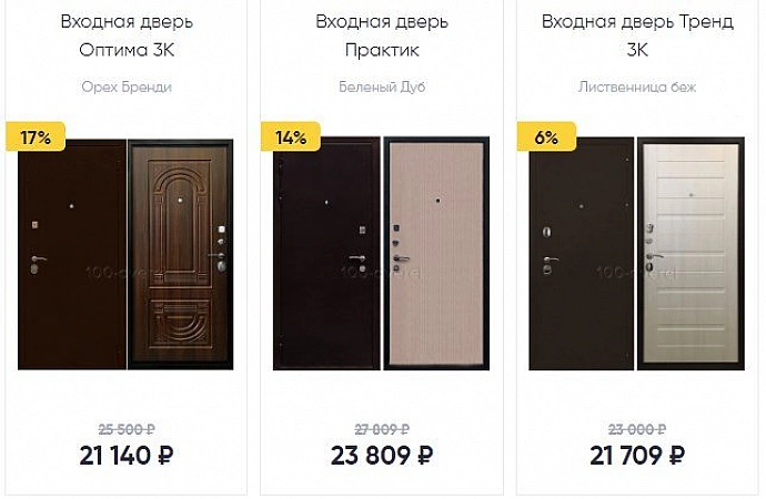 دخلت شركة "100 Doors" بجدارة في تصنيف الأفضل. تبيع الشركة أبوابًا من جهات تصنيع مختلفة وتقوم بتركيبها منذ أكثر من سبع سنوات ، اكتسبت خلالها سمعة طيبة وحظيت بثقة العملاء. تحتوي 100 Doors على تشكيلة ممتازة ، وهناك هياكل مدخل لمنزل ، وشقة ، مع عزل صوت محسّن ، بالإضافة إلى حريق ومضاد للتخريب وغيرها الكثير. يمكنك شراء المنتجات الرخيصة ، من 15 ألف روبل لباب معدني. هناك أيضًا نماذج أكثر تكلفة ، مدعومة بالخيارات اللازمة. لا يستغرق التثبيت الكثير من الوقت ، فالأخصائيين من ذوي الخبرة ويتم العمل بسرعة. الحد الأقصى لوقت الانتظار هو 3 أيام ، ويلاحظ العملاء في المراجعات أن الشركة تلتزم بالمواعيد المحددة. وشملت العيوب التصحيح المتردد لأوجه القصور ، بعد القبول بضرورة متابعتها بإصرار.