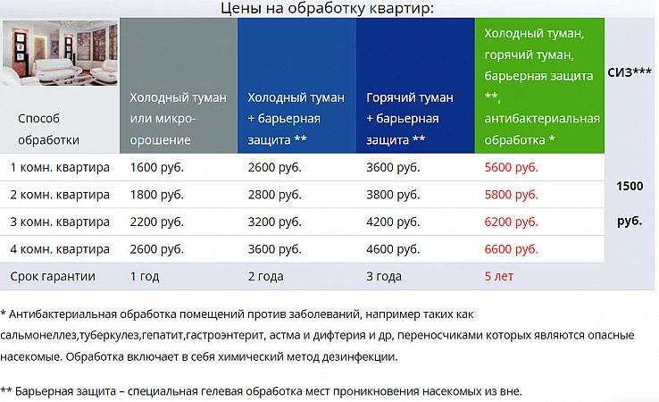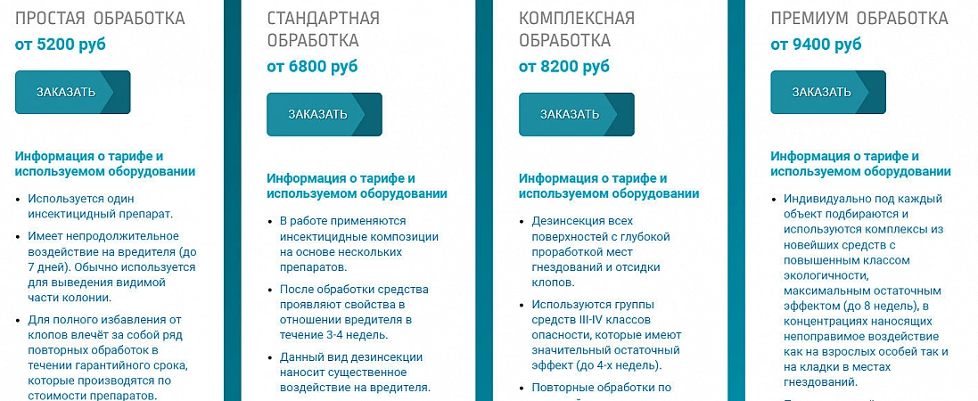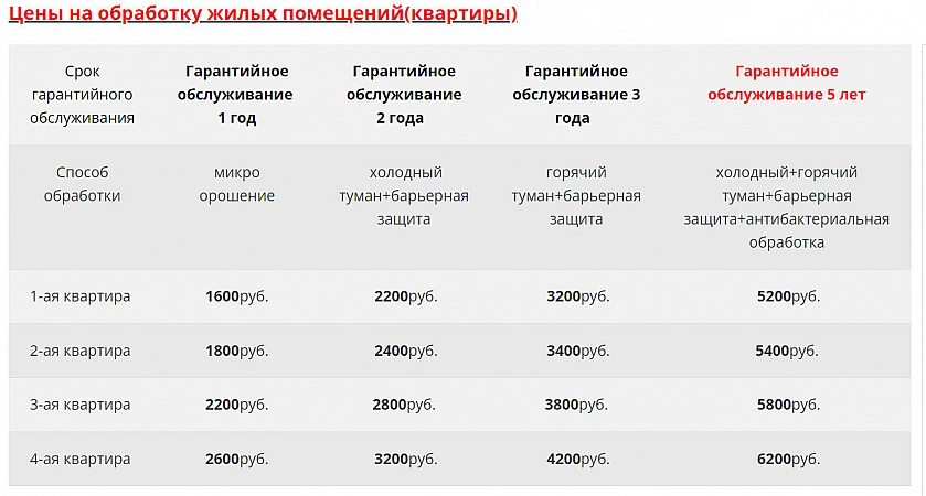 واحدة من أكثر شركات مكافحة الآفات رواجًا. تتعاون خدمة التطهير مع SES في موسكو ، وتستخدم أكثر الوسائل أمانًا لتدمير بق الفراش والجرذان والفئران والآفات. يغادر فريق من المبيدات في وقت مناسب للعميل: هناك إمكانية للمعالجة ليلاً وفي أيام العطلات وعطلات نهاية الأسبوع. تعمل الشركة مع رجال الأعمال والأفراد. الأشخاص ، ومعالجة الشقق والمباني من أي حجم. تكلفة خدمات الشركة ليست الأفضل ، لكنها مقبولة تمامًا. في المتوسط ، تكلف معالجة شقة من غرفة واحدة 1600-3200 روبل. الضمان - من 1 إلى 5 سنوات. صحيح ، للحصول على فترة ضمان أطول ، عليك اختيار العلاج الأكثر تكلفة. وأحيانًا يتعين عليك الاتصال بالمتخصصين للمرة الثانية وحتى الثالثة ، لكن كل هذا يتوقف على حجم العدوى.
