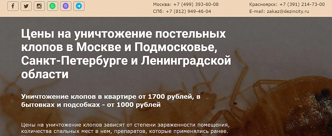 واحدة من أكثر الشركات التي أثبتت جدارتها في موسكو. وتشارك في التدمير السريع والفعال لبق الفراش ، وكذلك التخلص من الحشرات ، وتطهير المباني ، والقضاء على الآفات. تعتبر الخدمة الأفضل في موسكو بسبب العدد الكبير من المراجعات الإيجابية. تعمل الشركة مع أكثر الأدوية أمانًا للإنسان والحيوانات الأليفة ، وتستجيب للمكالمات يوميًا ، بغض النظر عن عطلات نهاية الأسبوع والعطلات. يقوم متخصصو الخدمة بمعالجة الشقق والمنازل الخاصة ومؤسسات تقديم الطعام والمحلات التجارية. تكلفة تجهيز السكن تتراوح بين 1600-6400 روبل. لكن في بعض الأحيان يمكن أن يكون السعر أعلى - يعتمد الكثير على حجم الغرفة وعلى الوسائل المختارة. بالمناسبة ، تعتمد فترة الضمان أيضًا على تكلفة عمل المبيدات: فكلما زاد المبلغ ، زادت مدة خدمة الضمان.