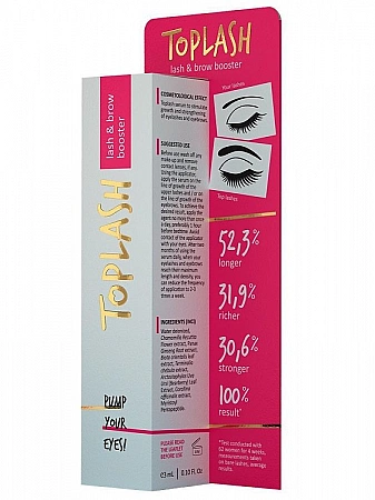 مصل الرموش والحواجب Toplash Lash and Brow Booster هو منتج مبتكر بتركيبة طبيعية عالية الجودة. يساعد على جعل الرموش والحواجب أكثر سمكًا وأقوى ، مما يحميهم من الآثار السلبية للعوامل الخارجية. ستكون النتائج الأولى مرئية بعد 3 أسابيع ، وسيتم تحقيق أقصى تأثير بعد شهرين من الاستخدام المنتظم. يمكن استخدام المصل للأغراض الطبية وللوقاية. تؤكد مراجعات النساء أن علاج Toplash يعمل حقًا ، على الرغم من أن البعض يكتب أن الرموش بعد تطبيقه تبدأ في النمو بشكل عشوائي في اتجاهات مختلفة. من الجدير بالذكر أيضًا أن العلاج يمكن أن يسبب الحساسية.