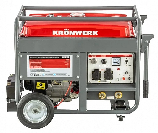 يمكنك أيضًا توفير المال عند شراء مولد لحام. على سبيل المثال ، عن طريق شراء Kronwerk LK 210E. هذه هي وحدة البنزين الأكثر ميزانية ، وتكلفتها أرخص مرتين تقريبًا من أقرب منافس. في نفس الوقت ، لديها خصائص تقنية مناسبة. القدرة - 4.5 كيلوواط بالقيمة القياسية وتصل إلى 5 كيلوواط في الذروة. القوة الحالية - تصل إلى 210 أمبير. نعم ، ليست أعلى القيم ، ولكنها كافية تمامًا ليكون اللحام بجودة عالية ويكون التماس متساويًا.يعمل جهاز العاكس على استقرار التيار تمامًا ويسمح لك بضبطه بزيادات قدرها 5 وحدات. تشير الشركة المصنعة إلى أن أقصى سمك للقطب هو 8 مم ، لكن من الأفضل عدم استخدامها. من الواضح أن الادعاء مبالغ فيه. العيب الرئيسي هو مستوى الضوضاء الذي يقارب 100 ديسيبل.