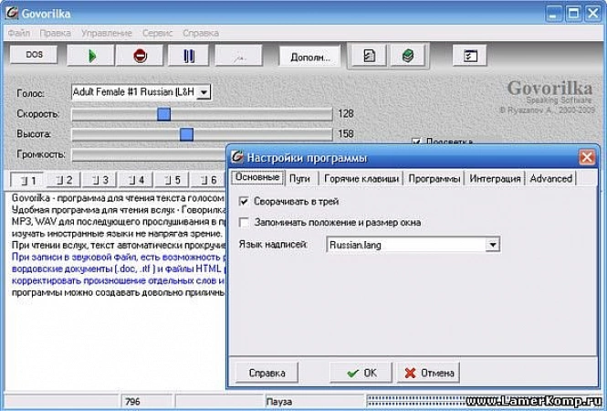 في البداية ، لم يتم تصور Govorilka كمشروع تجاري - كما يتضح من واجهة البرنامج البسيطة ، "القديمة" تقريبًا ، المصممة للإصدارات الأولى من Windows. ومع ذلك ، فإن آلة النطق مصنوعة بالفعل من الروح: فهي لا تقوم فقط بترجمة النص إلى كلام ، ولكنها توفر أيضًا أدوات للعمل السهل مع التمثيل الصوتي والملفات. أولاً ، عندما يتم تحميل الملف ، يقوم البرنامج تلقائيًا "بتمرير" النص لأسفل بطريقة الملعِم ويبرزه - حتى تتمكن من متابعة الجزء المقروء بسهولة.ثانيًا ، يمكن تحسين النطق عن طريق إضافة مجموعات إشكالية إلى قاموس البرنامج: بفضل مساهمة المستخدمين العاديين ، يُعتبر Govorilka أحد أكثر المُركِّبات العضوية صوتًا. تجدر الإشارة إلى أن الإصدار القياسي من البرنامج لن يتحدث الروسية إذا لم يكن لديك المحرك المناسب مثبتًا ، ولكن يمكن العثور على دليل مفصل لحل هذه المشكلة على الموقع الرسمي للمطور.