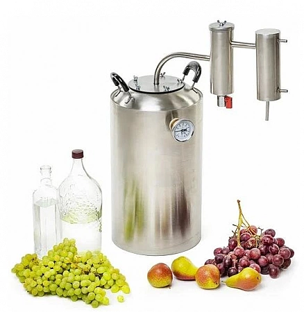 الحد الأقصى الذي يمكن عصره من هذا الجهاز هو 70٪ لغو. التصميم بسيط ، بدون مشابك.لن يكون من الممكن إضافة شيء ما وتحديثه بطريقة أو بأخرى. لكن النموذج شائع بين المبتدئين الذين يتقنون الأعمال المعقدة للتقطير. بادئ ذي بدء ، بسبب السعر المنخفض. يكلف جهاز التقطير الجاهز للاستخدام مع خزان سعة 20 لترًا حوالي 8000 روبل. تتضمن العبوة مكعب تقطير وجهاز تقطير غير قابل للفصل من قدر بخاري وثلاجة. تتم إزالة غطاء المجفف. عند التقطير ، يمكنك وضع الأعشاب والتوابل والتوت المجفف والفواكه للحصول على نكهة. الجودة ليست سيئة - اللحامات الأنيقة والفولاذ الجيد. للمنزل ، لأول مرة يمكنك أن تأخذه ، ولكن من المحتمل أنك سترغب في تغيير الجهاز خلال عام أو عامين. من عيوب التصميم - ميزان حرارة ثنائي المعدن ، بدون قضيب تصريف ، رقبة خزان حادة.