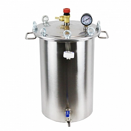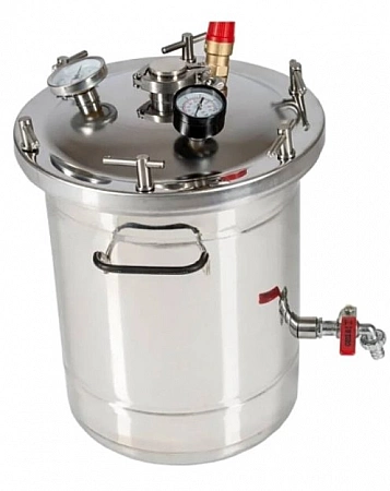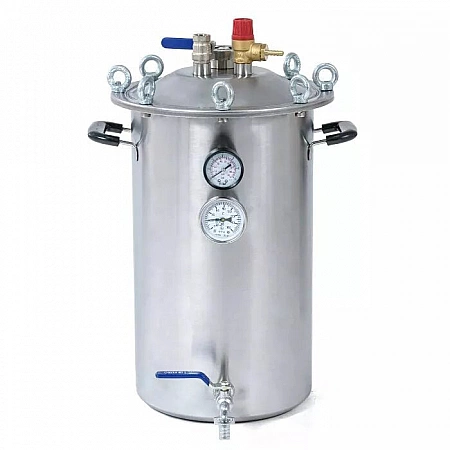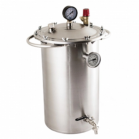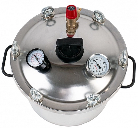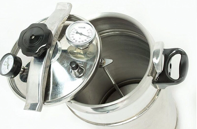 Depuis plus de 30 ans, l'usine d'équipements à gaz de Novogrudok, située en Biélorussie, produit des autoclaves à usage domestique. L'entreprise se spécialise dans la production de divers appareils à gaz et de produits connexes.L'expérience inestimable acquise à l'époque de l'Union soviétique aide les employés de l'entreprise à produire des produits de haute qualité, fiables et abordables. Le matériau pour la fabrication de l'autoclave est un acier au carbone à outils durable. Pour protéger contre la corrosion, le fabricant a appliqué une peinture en poudre. Bien qu'extérieurement, l'autoclave ressemble à une petite bouteille de gaz et que la couleur grise gâche quelque peu la conception du récipient, mais la surface se lave facilement et ne se décolore pas. Le fabricant biélorusse s'est également occupé de la sécurité de l'autoclave. En plus d'une fixation fiable du couvercle, il y a un manomètre et un mamelon pour réguler la pression dans le récipient.