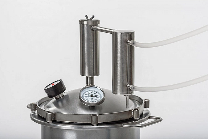 La société Armada est engagée dans la production et l'assemblage d'autoclaves et utilise des équipements haut de gamme. En fait, l'entreprise ne fabrique que les réservoirs eux-mêmes, et les composants attachés sont fabriqués à l'étranger, et ils n'économisent pas sur eux ici. Aucun thermomètre mécanique avec une erreur de 10 degrés ou plus. Pas de robinets à tournant sphérique en plastique chinois. Tout n'est que le plus moderne et le plus fiable. Bien sûr, cela affecte également la durabilité de l'appareil lui-même.En même temps, vous ne trouverez pas de distillateurs dans le catalogue. La société ne produit qu'un autoclave à gaz domestique Vyatka de différentes capacités. Mais il suffit d'acheter un module bon marché avec un distillateur et un réfrigérateur, et maintenant vous avez déjà un clair de lune à part entière toujours au prix le plus attractif. Eh bien, la facilité d'installation du distillateur vous permettra de changer rapidement la destination de l'équipement et de ne pas garder deux casseroles encombrantes dans la cuisine.