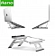 Cada persona de negocios o estudiante lleva una computadora portátil. Es un inconveniente mantenerlo de rodillas, pero un soporte especial siempre vendrá al rescate. En apariencia, esta es una mesa plateada ordinaria, sin ventiladores ni puertos USB. Sin embargo, la funcionalidad y la sencillez no restan valor a las ventajas del stand. Debido a la ausencia de todo lo superfluo, es compacto y ligero. Montado sobre patas plegables especiales. La posición se puede ajustar en altura, configurando un ángulo de visión cómodo. Los compradores en sus revisiones notan la alta resistencia del producto debido a la carcasa de metal y la facilidad de movimiento. El soporte es adecuado para Macbook y otros modelos de portátiles.
