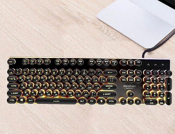 En el ranking de los productos más geniales y útiles para la computadora, es imposible prescindir de un teclado para juegos. Este modelo se diferencia de sus competidores por la original forma de las teclas: son redondas. El accesorio está disponible en tres versiones, pero solo una versión tiene letras rusas.El teclado está hecho en negro, cada tecla está resaltada en naranja o en varios colores. El panel está hecho de aleación de aluminio y el vendedor de AliExpress afirma que es resistente al agua. las migas y el polvo no se acumularán en el interior. Las revisiones señalan que el teclado está bien hecho, viene sin daños, a pesar del empaque más simple. Las teclas se presionan suave y silenciosamente, las letras brillan intensamente en la oscuridad. Lo único negativo es que resbala sobre la mesa, por lo que es mejor usar una alfombra.