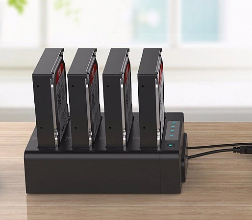 Una estación de acoplamiento para 4 discos duros ampliará significativamente el potencial para el uso simultáneo de varias unidades. Debido a la interfaz USB 3.0, la tasa de transferencia de datos es de hasta 5 GB por segundo. No se requieren herramientas o programas para la instalación. El estuche está hecho de plástico ABS negro de alta calidad, que no acumula huellas dactilares, polvo ni suciedad. Dispone de indicador LED para indicar el modo de funcionamiento de los puertos y un interruptor independiente. Le permite mantener los discos duros en posición vertical sin comprometer la funcionalidad. Se recomienda eliminar el almacenamiento usado solo después de apagar el dispositivo, para no dañar los datos. Según el fabricante, el módulo puede "leer" hasta 32 GB de memoria en el disco duro.