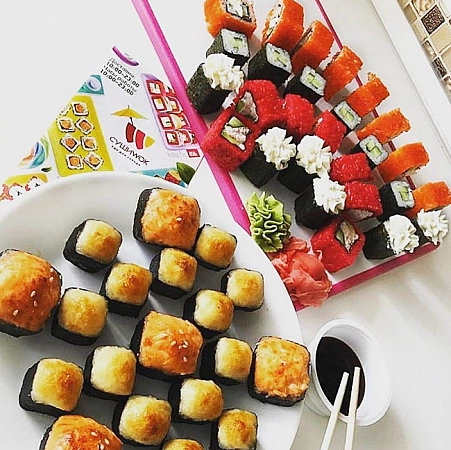 Bastante famoso, pero no el restaurante de entrega de comida japonesa más popular en Ufa. Las ventajas obvias incluyen la ausencia de un monto mínimo de pedido, entrega económica dentro de los 100 rublos, precios asequibles, ligeramente más bajos que el promedio de la ciudad. Muchos compradores están completamente satisfechos con la calidad de las comidas preparadas. A menudo escriben reseñas sobre una fina capa de arroz, una gran cantidad de ingredientes y una apariencia apetitosa. Se pone una ventaja separada para una deliciosa bebida de frutas. Las reclamaciones por entrega de mensajería son raras. Pero también hay compradores que consideran que los rollos de Sushi Wok están lejos de ser los más deliciosos. Escriben lo mismo sobre otros platos que ofrece el restaurante.