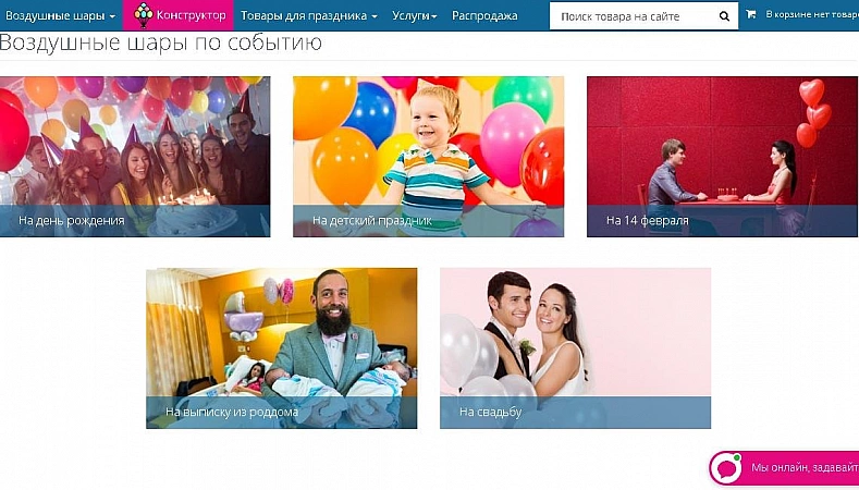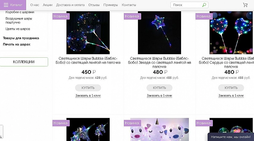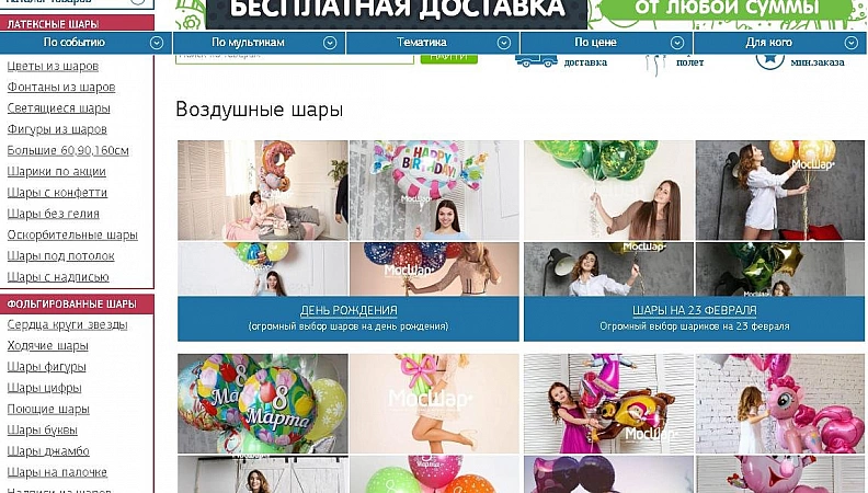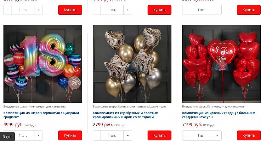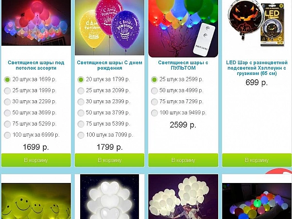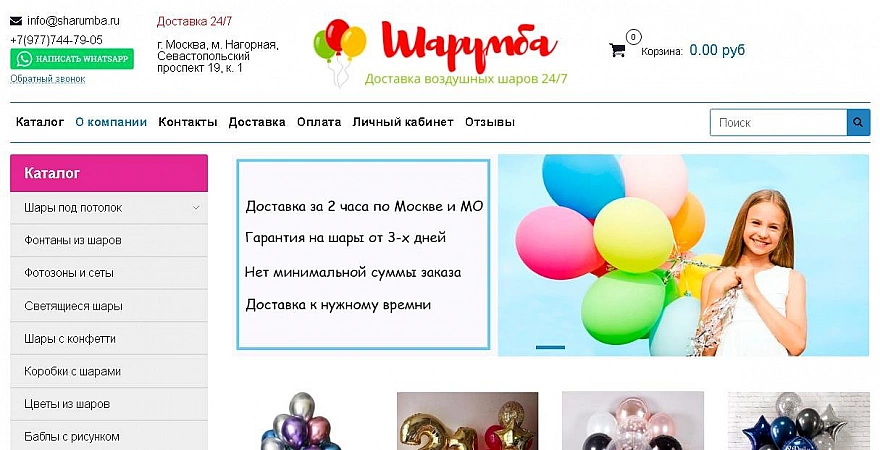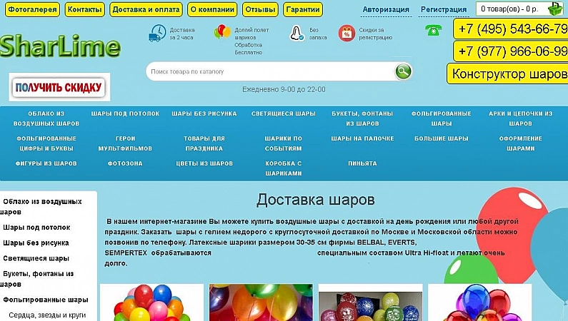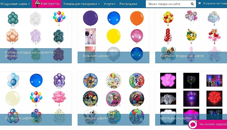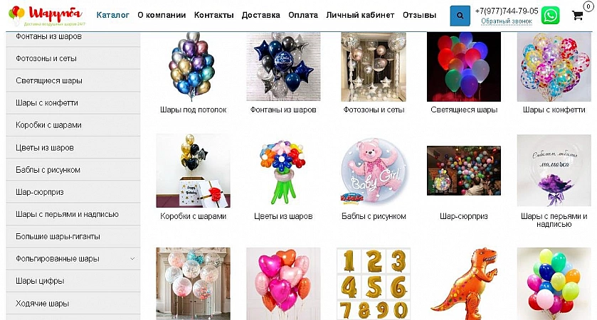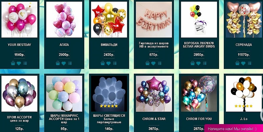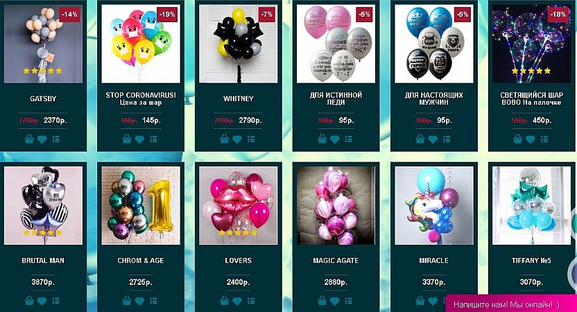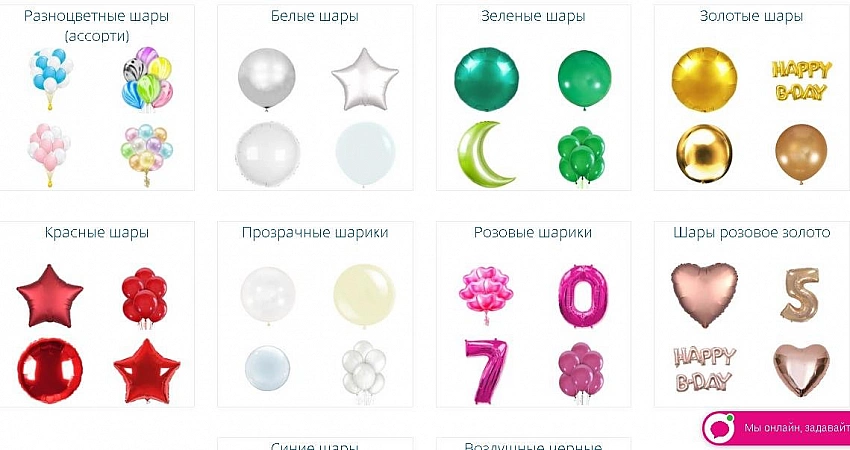Lo que agrada en esta tienda en línea con entrega es una gran variedad de hermosos, brillantes y originales globos de helio. Aquí puede encontrar soluciones muy interesantes para cualquier evento: el cumpleaños de un niño, una boda, el alta del hospital o simplemente una sorpresa para su ser querido. Para aquellos que no saben cómo decorar mejor la habitación y qué bolas elegir, se ofrecen soluciones listas para usar. El trabajo de recepción de solicitudes y cumplimiento de pedidos se lleva a cabo las 24 horas, la entrega en Moscú cuesta desde 390 rublos. El monto mínimo del pedido es de 1400 rublos, los clientes reciben un 10% de descuento por autoentrega. Pero los compradores a veces se quejan de que los mensajeros llegan tarde y que los globos se desinflan demasiado rápido.