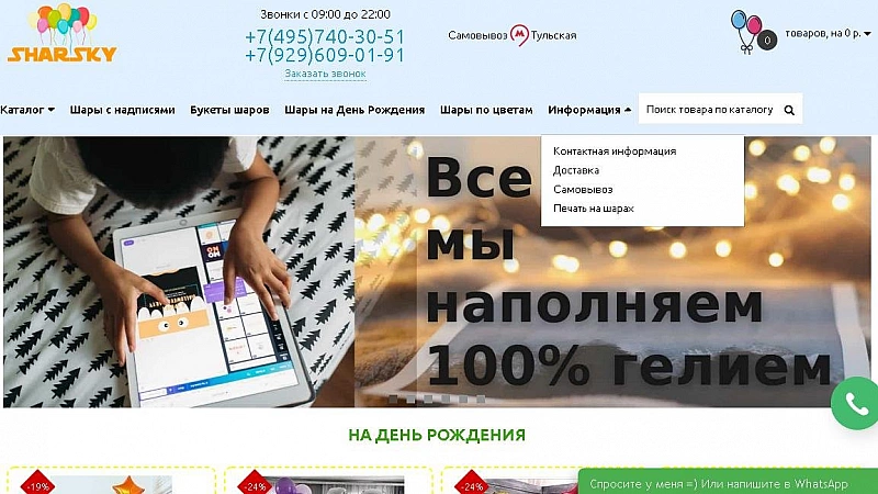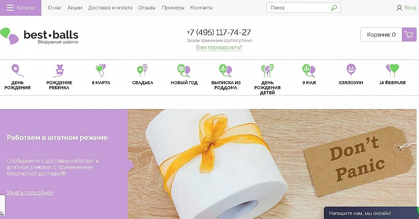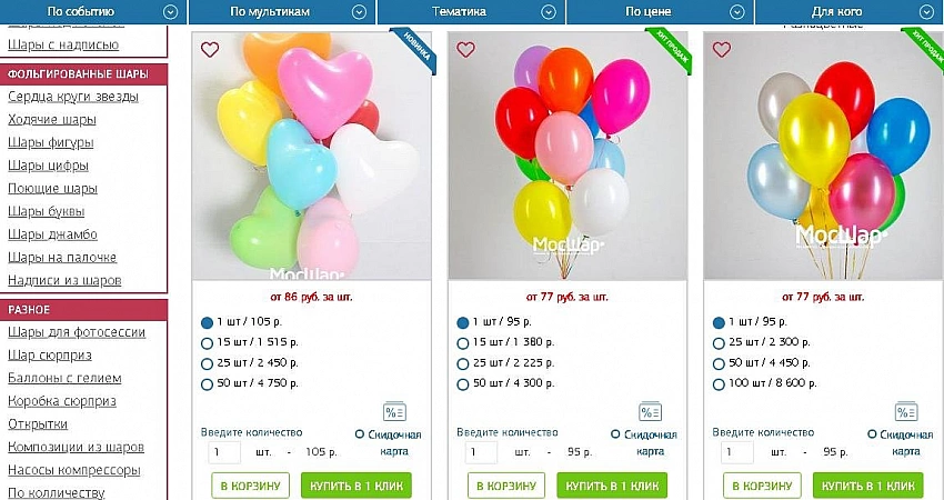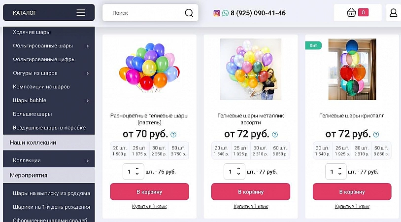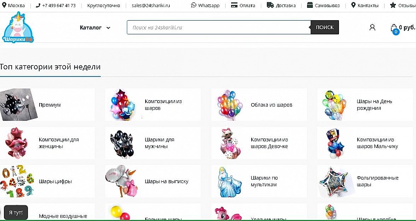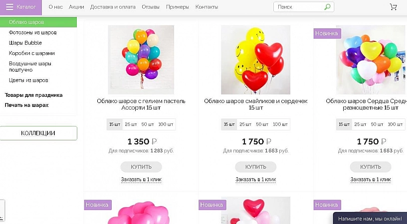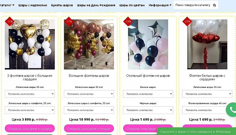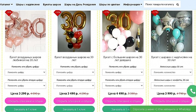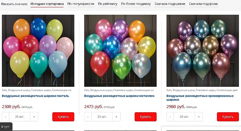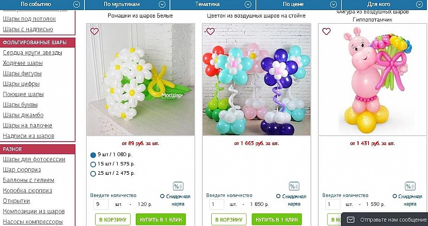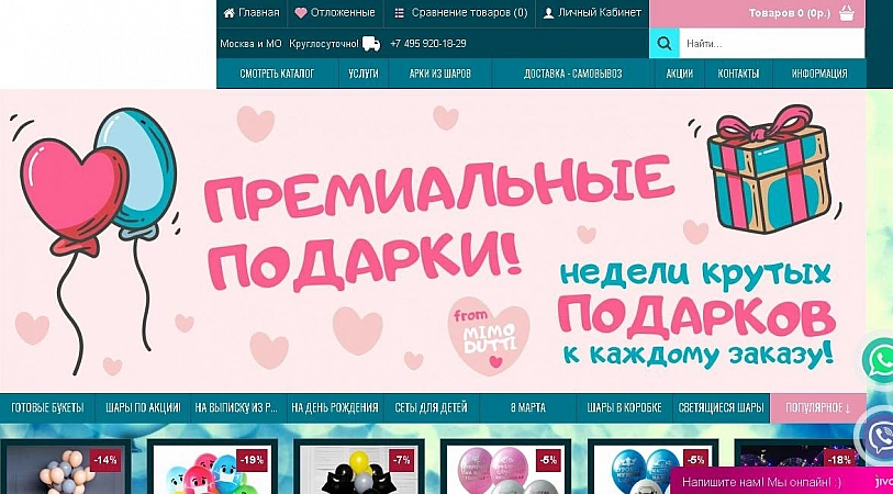 Lo que agrada en esta tienda en línea con entrega es una gran variedad de hermosos, brillantes y originales globos de helio. Aquí puede encontrar soluciones muy interesantes para cualquier evento: el cumpleaños de un niño, una boda, el alta del hospital o simplemente una sorpresa para su ser querido. Para aquellos que no saben cómo decorar mejor la habitación y qué bolas elegir, se ofrecen soluciones listas para usar. El trabajo de recepción de solicitudes y cumplimiento de pedidos se lleva a cabo las 24 horas, la entrega en Moscú cuesta desde 390 rublos. El monto mínimo del pedido es de 1400 rublos, los clientes reciben un 10% de descuento por autoentrega. Pero los compradores a veces se quejan de que los mensajeros llegan tarde y que los globos se desinflan demasiado rápido.