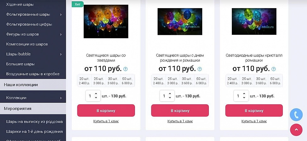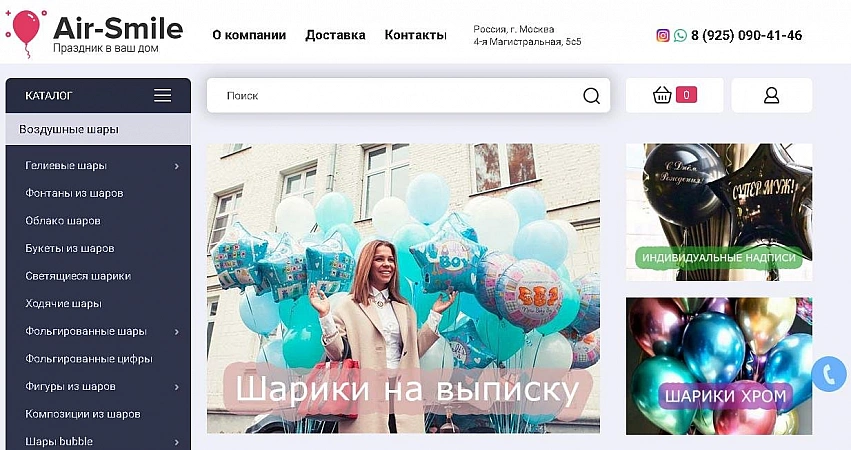 En Air-smile puedes encontrar globos de helio para cualquier ocasión, ya sea una boda, cumpleaños, alta hospitalaria o algún otro evento especial. El surtido incluye tanto las opciones más simples como las más económicas, así como bolas luminosas para caminar, modelos de gran tamaño. Previo acuerdo, puede poner su propia inscripción. La empresa ofrece varias composiciones, globos de regalo en una caja. Aquí también puede comprar otros productos para las vacaciones, dejar una solicitud para decorar el local. Al realizar un pedido desde 1500 rublos, la entrega en Moscú costará desde 390 rublos. Con una cantidad menor de 500 rublos, es posible la recogida en la tienda.