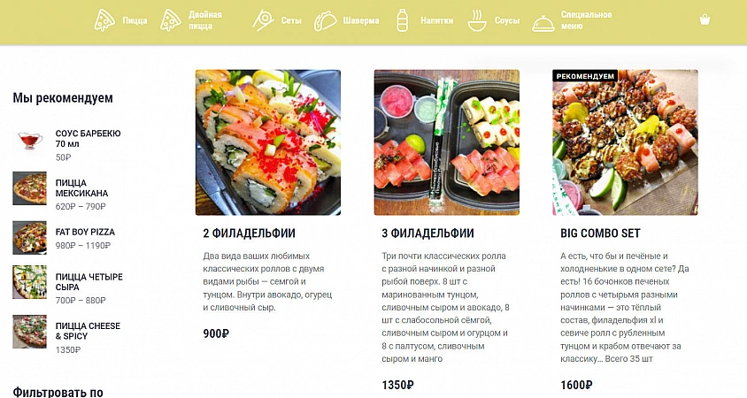 Cafetería con comida para llevar y servicio en el establecimiento. Entrega pedidos diariamente, los acepta tanto por teléfono como en línea en el sitio web. Los mensajeros llevan la comida a tu casa dentro de la ciudad: la entrega a zonas remotas se acuerda individualmente. El menú aquí es extenso: hay pizza, sushi, panecillos, conjuntos y postres.Los precios son promedio para la ciudad, sin embargo, algunas posiciones son un poco caras. Por ejemplo, la pizza Calzone cuesta aquí 400-450 rublos. con un peso de tan solo 490-580 gr. Además, los conjuntos horneados no son baratos aquí. Pero los juegos fríos y mixtos en los cafés son bastante asequibles: el costo de los más económicos varía entre 700 y 2500 rublos. El establecimiento prácticamente no tiene inconvenientes, excepto los altos precios, pero es necesario trabajar en algunos chefs. Hay reseñas en las que los clientes de la cafetería se quejan del mal gusto de los panecillos. También hay quienes no están satisfechos con la preparación de pedidos.