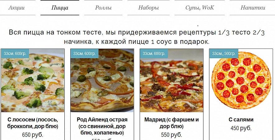 La mejor entrega de panecillos, gunkans y pizza entre establecimientos económicos. Acepta pedidos en días festivos y fines de semana. Una buena ventaja aquí es la entrega a domicilio gratuita en todo el distrito Moskovsky de Kaliningrado. No es posible realizar un pedido en el sitio web durante todo el día, pero puede realizar un pedido por adelantado por teléfono durante el horario comercial. La elección aquí es muy amplia: el menú incluye pizzas finas y esponjosas (35 variedades), platos para vegetarianos, verduras y pescado, carne, panecillos horneados. El restaurante también ofrece gunkans a la orden con salmón y cangrejo. Prácticamente no hay quejas sobre la calidad de los alimentos, con la excepción de pequeños defectos en forma de panecillos calientes enfriados rápidamente y tamaños pequeños de pizza delgada. Pero muchos no están satisfechos con el hecho de que la comida se lleva solo a los residentes de la región de Moscú. Sí, el pedido se puede recoger, pero para algunos clientes, la entrega puerta a puerta es más adecuada.
