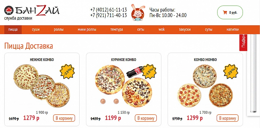 Entrega de panecillos, WOK y pizza con precios adecuados, horario de trabajo conveniente y promociones periódicas. Puede pedir comida a domicilio por teléfono o en el sitio web: el menú está detallado, los productos con descuentos se indican de inmediato. Sí, la organización no funciona las 24 horas, pero aquí puedes hacer un pedido anticipado desde la tarde hasta la mañana del día siguiente. La pizza aquí, a juzgar por las reseñas, es la mejor de todo Kaliningrado. Siempre hay muchos ingredientes, la masa es fina y crujiente. Los panecillos tampoco son inferiores en calidad a los pasteles: los productos son frescos, el tamaño es bueno, los trozos de pescado son grandes, no translúcidos. Sin embargo, mucho depende del turno. Algunos clientes se quejan de la rigidez del nori y la abundancia de arroz en los rollos, pero las críticas negativas son raras.