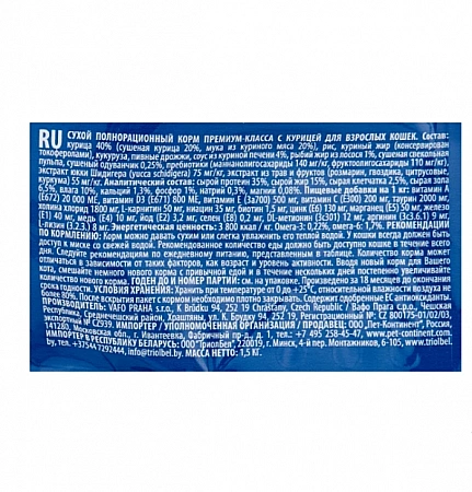 Comida Purina económica, pero posiblemente la mejor en su clase. Tiene una buena composición, cercana a los productos premium. Pero en el primer lugar de la lista de ingredientes siguen estando los cereales. La carne y sus derivados ocupan el segundo lugar, es decir, hay mucha proteína animal (20%), pero se desconoce su origen y calidad. También contiene vegetales, grasas vegetales y animales, antioxidantes y conservantes no especificados. No se puede llamar a una buena composición de alimentos: definitivamente no deben administrarse a gatos británicos, escoceses y otros gatos de pura sangre con un sistema digestivo sensible. Lo más probable es que la base de la carne sea despojos. Pero algunos usuarios enfatizan las ventajas del alimento como el bajo costo, un contenido bastante alto de minerales y vitaminas. Pero los veterinarios recomiendan considerar alimentos de mejor calidad y usar marcas de clase económica en casos extremos y no para alimentación a largo plazo.