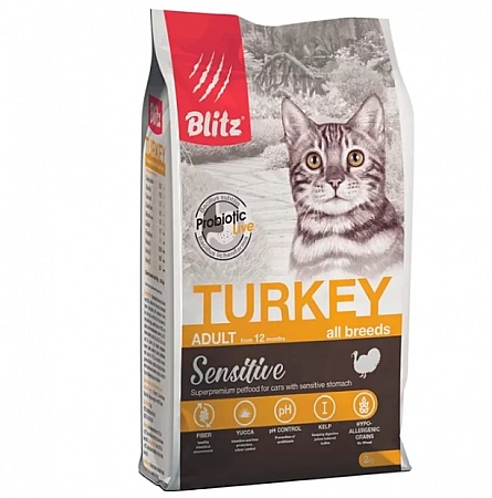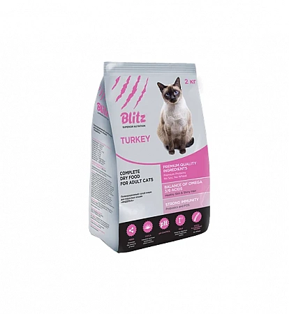 El fabricante ofrece alimentos secos para gatas embarazadas, esterilizadas, gatitos, así como opciones universales. La composición es buena: carne deshidratada, proteína hidrolizada, hígado de pollo y huevos, es decir, el contenido de proteína es alto. Además del arroz, se utiliza el maíz como fuente de carbohidratos, lo que no se considera la mejor opción. Fibra: manzanas secas, remolachas, estigmas de maíz. También contiene pollo y aceite de pescado. Los veterinarios notan un buen conjunto de suplementos adicionales: probióticos, Yucca Schidegera para reducir el olor a excremento, algas marinas, vitamina E. Los criadores y solo los dueños de gatos notan que cuando se cambia a una nutrición permanente con el alimento Blitz, la condición de las mascotas mejora notablemente: el el cabello deja de caerse, aumenta la actividad, hay problemas con la digestión.