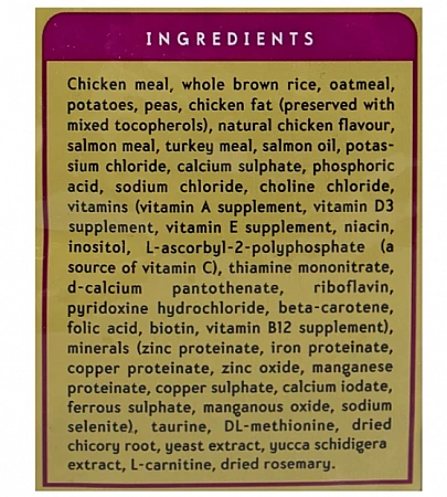 - Mucha proteína animal, parte superior de la lista de ingredientes.