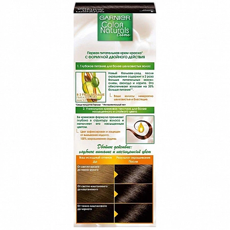 La coloración en crema nutritiva permanente Color Naturals de GARNIER garantiza una coloración de alta calidad y un cuidado inigualable. Tres aceites naturales ayudan a mantener los rizos hidratados, agregando brillo y luminosidad naturales. El pigmento penetra profundamente, cubriendo el 100% de las canas y manteniendo el color hasta por 8 semanas. La conveniente formulación en crema asegura que el producto no gotee después de la aplicación. Incluye pintura, revelador de leche, polvo decolorante, crema de cuidado, guantes. Vale la pena considerar que el volumen de un paquete es suficiente solo para un peinado de longitud y densidad medias. Debido a la presencia de amoníaco, el olor del producto es bastante acre. No se mencionan otras deficiencias en las revisiones de esta pintura.