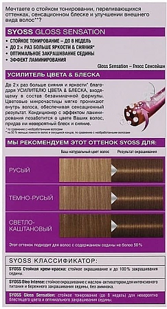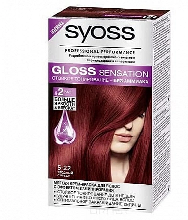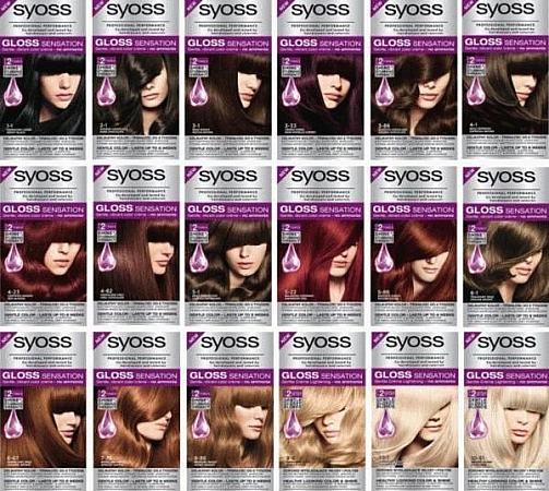 Syoss Gloss Sensation es un color duradero pero suave sin el uso de amoníaco. El color se conserva hasta 8 semanas y el cabello se vuelve suave y radiante como después de la laminación. La herramienta tiene un olor agradable, no daña los hilos, tiene una textura cómoda. El kit incluye una botella aplicadora conveniente con leche en desarrollo, pintura en crema, bálsamo, guantes. Para un peinado largo y grueso, una botella no será suficiente. Pinte completamente sobre canas, según las revisiones, no todos los tonos propuestos pueden.