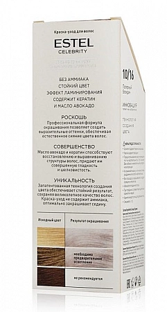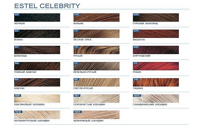 La pintura en crema Celebrity es producida por la marca rusa ESTEL, tiene un precio bastante asequible, pero puede ofrecer una coloración duradera y de alta calidad sin dañar el cabello. El producto no contiene amoníaco, pero contiene queratina, aceite de aguacate y pantenol, que es útil en todos los sentidos. Hay 25 tonos diferentes en la paleta, la mayoría de los cuales son geniales para deshacerse de las canas.El kit incluye un tubo de crema colorante, dos sobres de oxígeno, un sobre de bálsamo y un par de guantes. Aunque el fabricante habla de durabilidad, las revisiones a menudo dicen que se lava rápidamente y que primero pinta con agua y una toalla. La concentración de oxígeno es del 9%, que es bastante alta y puede provocar la sequedad del cabello.