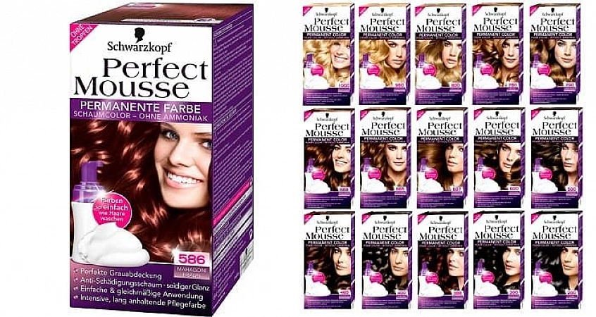 La espuma de pintura Perfect Mousse de Schwarzkopf es capaz de garantizar la coloración más cómoda. Gracias a la estructura conveniente de la mousse, no fluye durante la aplicación, y la botella con el aplicador le permite distribuirla rápidamente por el cabello. A pesar de la ausencia de amoniaco, el color es persistente y saturado, cubriendo de forma fiable las canas. El kit incluye un gel colorante, una botella aplicadora con una emulsión reveladora, acondicionador, guantes. La mayoría de las mujeres que han probado Perfect Mousse hablan positivamente de la pintura, citando solo una selección relativamente pequeña de tonos, guantes incómodos y de gran tamaño como su inconveniente.