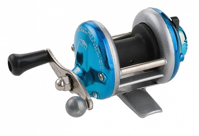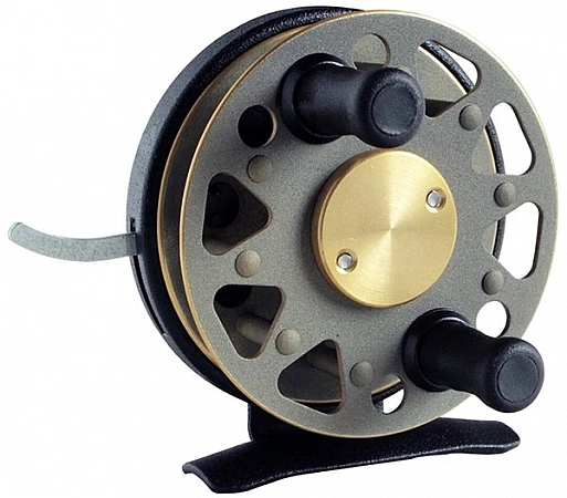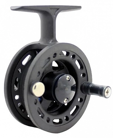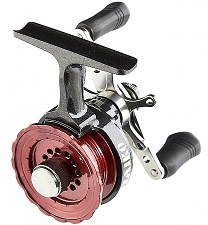 Un carrete en un factor de forma inusual que proporciona un control cómodo incluso con guantes grandes en la pesca en hielo.
