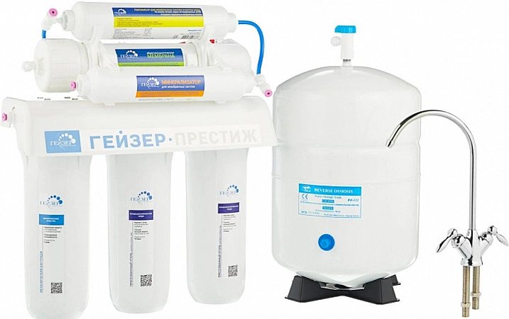 Sistema de ósmosis inversa funcional y económico para una casa privada, apartamento con un tanque grande. El modelo de la empresa rusa Geyser tiene un buen rendimiento: 0,13 l / min, funciona a una temperatura del agua de +4 ° C a +40 ° C. Los filtros están diseñados para una larga vida útil: hasta 9 meses sin reemplazo. Por cierto, los consumibles en sí son bastante asequibles (en comparación con otros sistemas de tratamiento de agua).Agua, según las revisiones, la salida es sabrosa y sin sabores / aromas desagradables extraños. Es cierto que al elegir este modelo, debe verificar cuidadosamente la configuración y la calidad de construcción de su cuerpo. Se trata de matrimonio de fábrica: de vez en cuando, los usuarios se encuentran con instancias con accesorios que se desmoronan, brechas, que se encuentran dentro de 1 a 3 meses. empezar a fluir