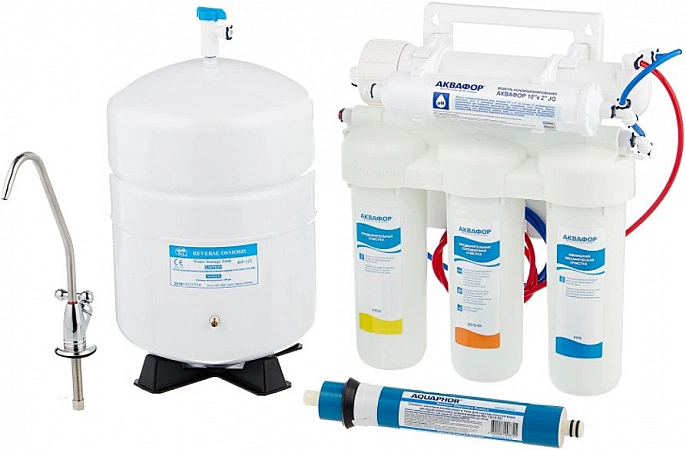 El sistema de ósmosis inversa más barato del ranking. Puede comprarlo en algunos minoristas en línea por solo 7200-7500 rublos.