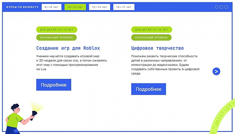 Ideal para estudiantes que quieren aprender a programar. El sistema educativo se divide en bloques por edades: para alumnos de 8 a 10 años, de 10 a 12 años, de 12 a 15 años y de 14 a 17 años. Puedes dominar cualquier dirección: Python, Unity, Roblox, etc. No hay conferencias aburridas en Kodland, y en el salón de clases, los niños crean juegos y programas reales. Puede evaluar la calidad de la educación de forma gratuita: simplemente regístrese para una lección de prueba y el maestro seleccionará un horario individual y le dirá cómo irá todo. De lo desagradable: la comunicación de video a veces se interrumpe o se ralentiza y no es fácil percibir el material debido a esto. Además, el sitio en sí a veces no funciona correctamente y no brinda acceso al recurso, mientras que el servicio de soporte solo se encoge de hombros.