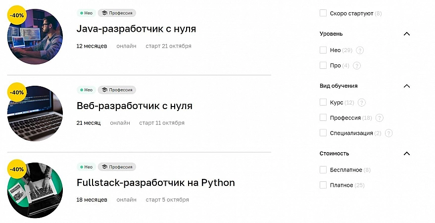 "Netology" tiene una gran cantidad de programas pagos y gratuitos relacionados con la esfera de TI. Hay cursos para principiantes y programadores experimentados que te ayudarán a dominar la especialidad elegida a un buen nivel.