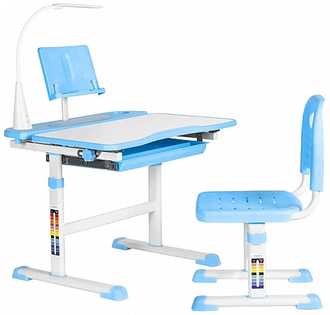 Entre kits similares, este se distingue por su configuración. Junto con la mesa y la silla, el fabricante ofrece una lámpara de mesa, un atril para libros y un organizador extraíble.